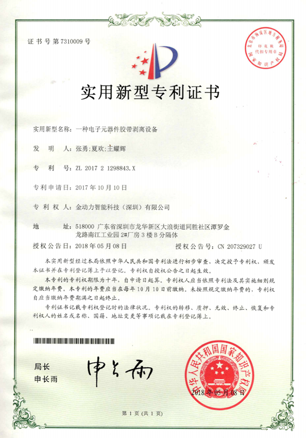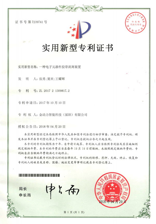 10一(yī)種電(diàn)子(zǐ)元器(qì)件(jiàn)膠帶剝離(lí)設備專利證書(shū)