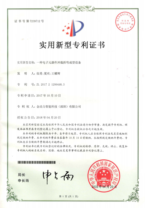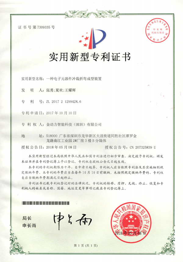 05一(yī)種電(diàn)子(zǐ)元器(qì)件(jiàn)沖裁折彎成型設備專利證書(shū)