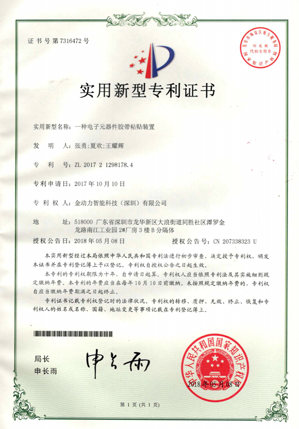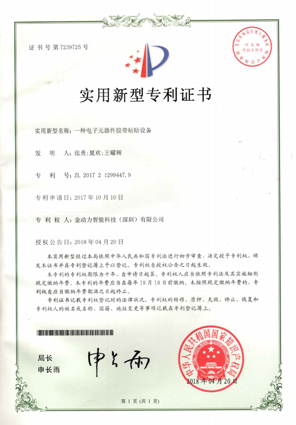 04一(yī)種電(diàn)子(zǐ)元器(qì)件(jiàn)膠帶粘帳号設備專利證書(shū)