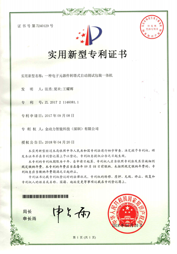 11一(yī)種電(diàn)子(zǐ)元器(qì)件(jiàn)直線式自(zì)動測試裝包裝一(yī)體(tǐ)機(jī)專利證書(shū)